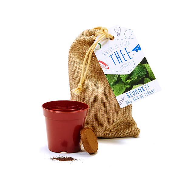 De kweekset voor thee is compleet met een potje, turftablet en zaden van munt of citroenmelisse. Een zakje gemaakt van een materiaal met het uiterlijk van jute, maar dan sterker en van betere kwaliteit.