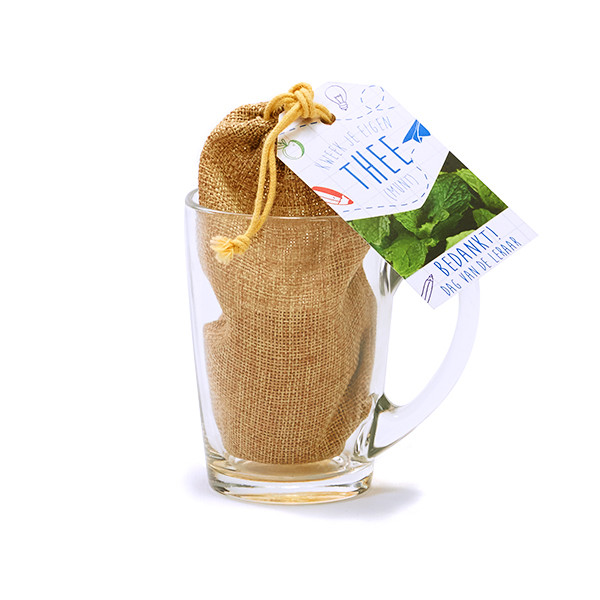 Kweek je eigen citroenmelisse of munt thee! Een groen geschenk voor alle theeleuten binnen de onderwijsinstelling. Laat je waardering blijken en schenk alle juffen en meesters een kweekset voor thee in een theeglas.